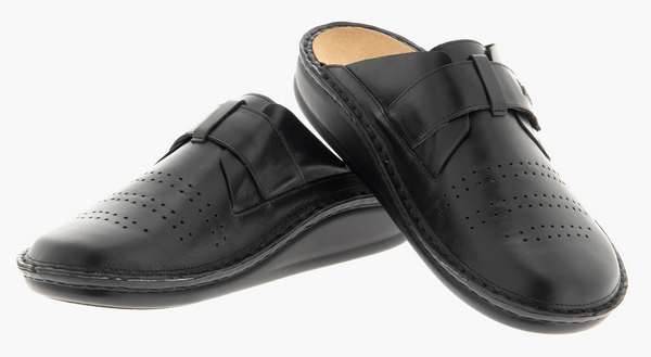 Анатомические тапочки с увеличенной полнотой-легкие и удобные. Комфортная стильная модель для дома и улицы. Сабо из натуральной кожи с амортизирующей полиуретановой подошвой. Съемная перфорированная анатомическая стелька с покрытием из микрофибры обладает гигроскопичностью и предотвращает скольжение стопы, её форма обеспечивает поддержку свода ,распределяет нагрузку на позвоночник, предотвращает появление усталости, боли в спине и ногах. Широкая липучка обеспечивает большое раскрытие, позволяя легко надеть обувь на любую ногу и отрегулировать модель по подъему и полноте.