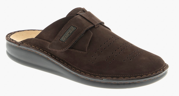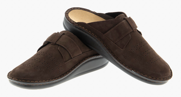 Анатомические тапочки с увеличенной полнотой-легкие и удобные. Комфортная стильная модель для дома и улицы. Сабо из натуральной кожи с амортизирующей полиуретановой подошвой. Съемная перфорированная анатомическая стелька с покрытием из микрофибры обладает гигроскопичностью и предотвращает скольжение стопы, её форма обеспечивает поддержку свода ,распределяет нагрузку на позвоночник, предотвращает появление усталости, боли в спине и ногах. Широкая липучка обеспечивает большое раскрытие, позволяя легко надеть обувь на любую ногу и отрегулировать модель по подъему и полноте.